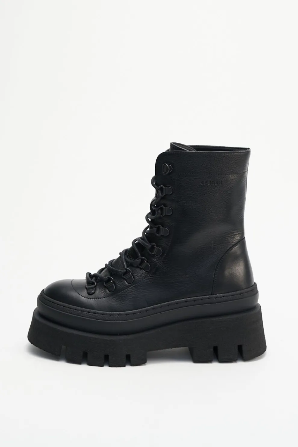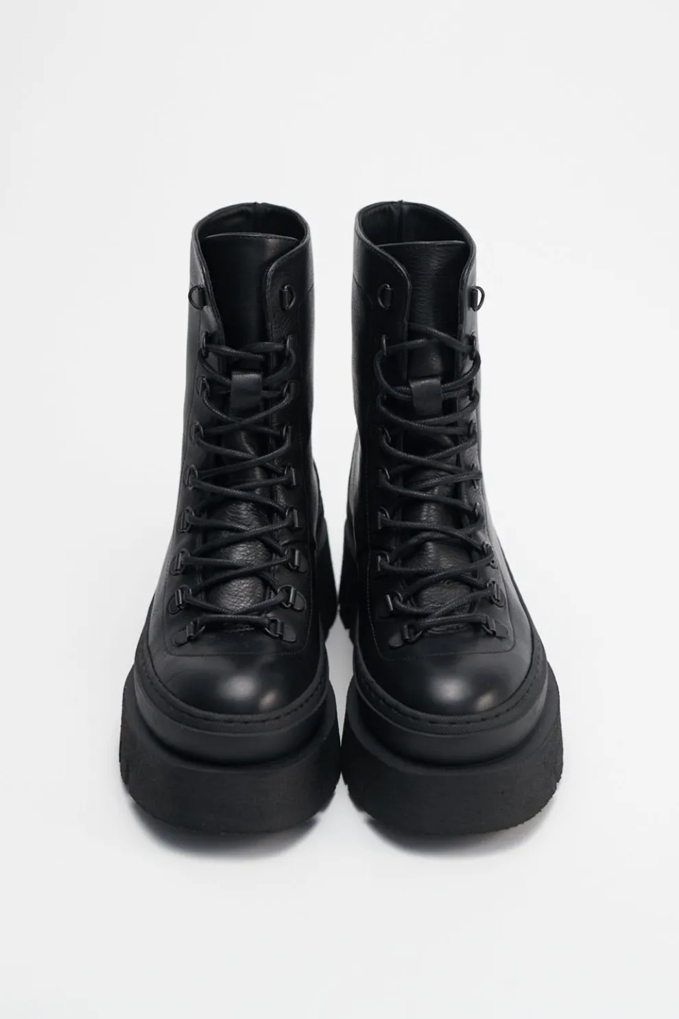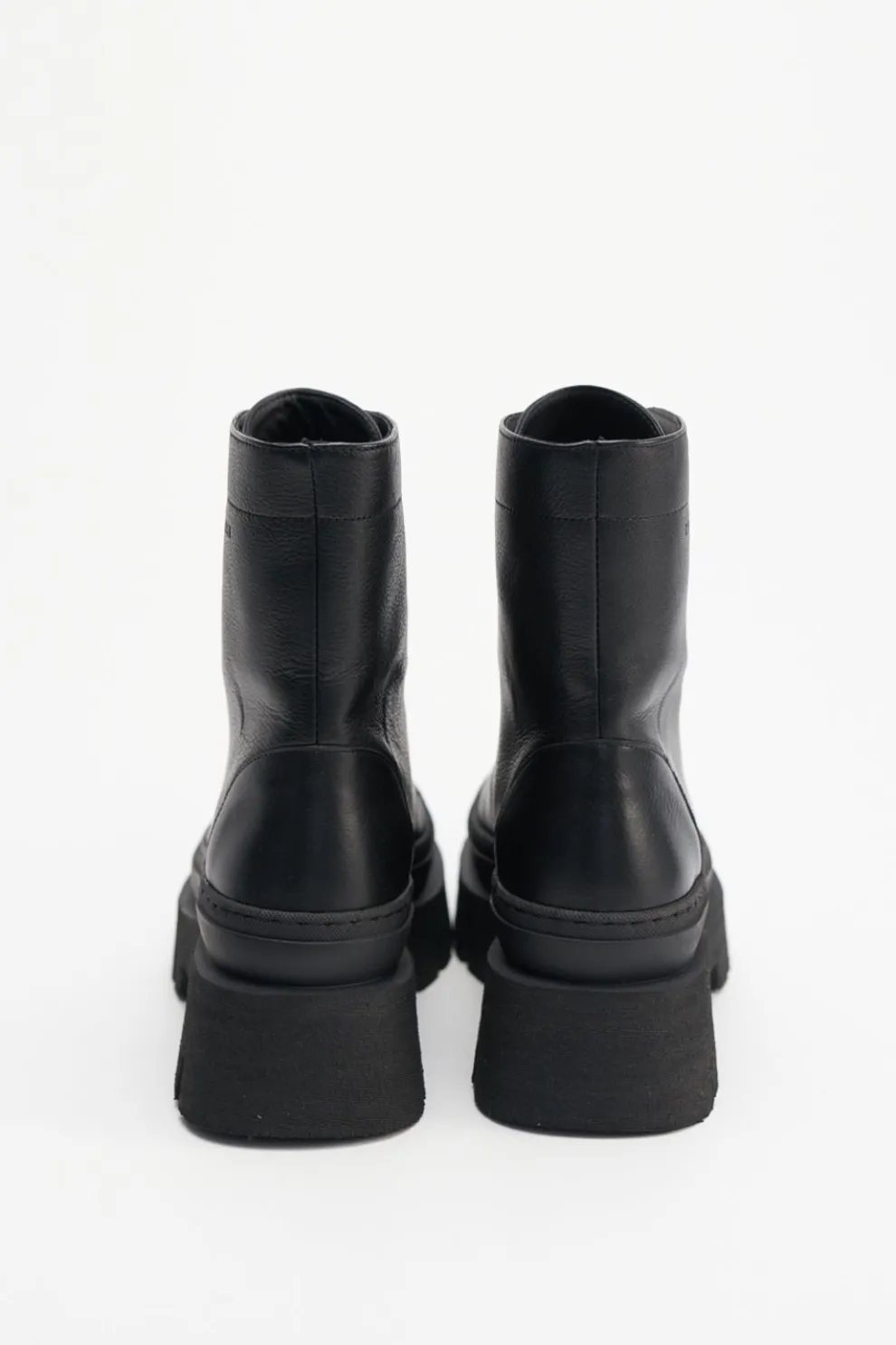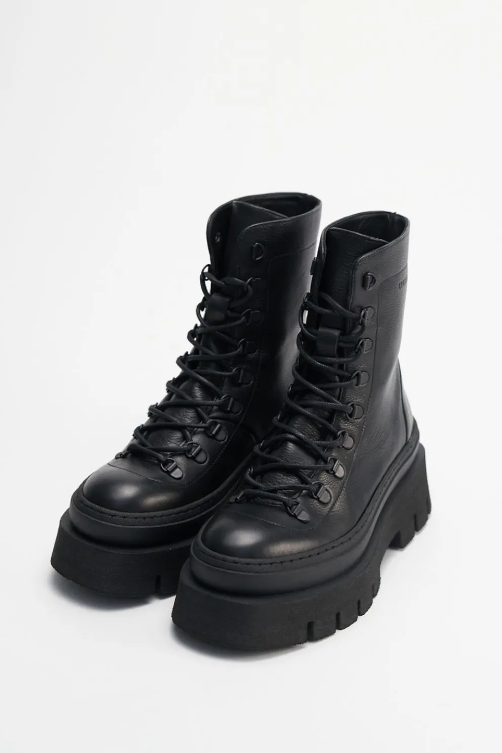 In Het Zwart. Middelhoge Veterlaarzen Gemaakt Van Glad Leer. Gevechtssilhouet Met Ronde Dop. Tonale Veters En Hardware. Gestempeld Logo Aan De Buitenkant. Een Expressieve Stijl Die Je Op Elke Situatie Voorbereidt.Onze Schoenen Zijn Ontworpen In Kopenhagen En Vervaardigd In Europa. Het Leer Komt Uit Geselecteerde Familiebedrijven In Italië.